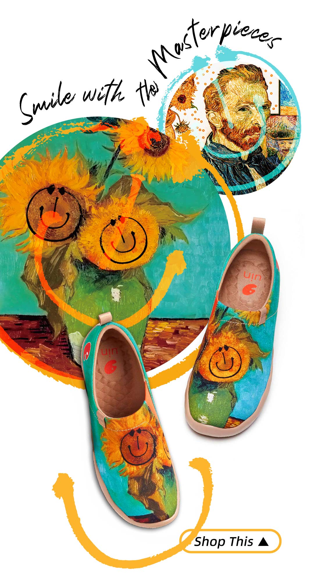 An unique twist to one of Van Goghโs fabulous sunflower paintings. By reshaping this masterpiece with pure color brushes, this vintage painting radiates a new kind of charm. Everyone could be an artist, be the spokesperson of the smiling lifestyle.